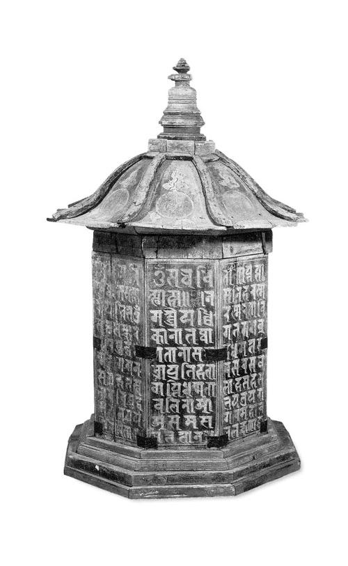 西夏木緣塔為西夏墓葬中第一次發(fā)現(xiàn)的西夏葬器。該塔通高75厘米,塔頂邊沿寬47厘米,呈四層八角形,飾紅色;分塔座、塔身、塔頂和塔剎四部分。塔座為四級八邊臺階。塔身為八邊柱體形,由長34厘米、寬12.5厘米、厚2厘米的八塊木板合成,表面涂藍色,每邊有黃色工整梵文“陀羅尼”,并用漢文注明陀羅尼經名。塔頂為傘式八邊形,每邊彩繪云氣紋和一個梵文字,內有墨書“故考任西經略司都案劉德仁,壽六旬有八,于天慶五年歲次戊午四月十六日亡歿,至天慶七年歲次庚辰(申)口夏十五日建緣塔,至中秋十三日入課訖”。塔剎圍欄為八邊形,其他相輪、覆缽、剎頂都是圓形,由下向上收分;底座周圍繪有卷草紋。