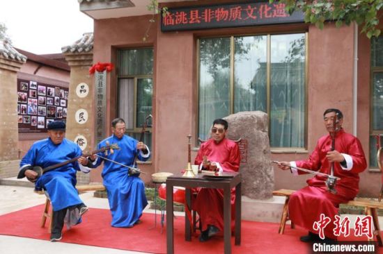 10月12日,甘肅省定西市臨洮縣舉行非物質(zhì)文化遺產(chǎn)展示中心啟動(dòng)儀式。圖為當(dāng)?shù)仄び皯騻鞒腥粟w學(xué)兵(右二)帶領(lǐng)班社表演影子腔?!堟?nbsp;攝