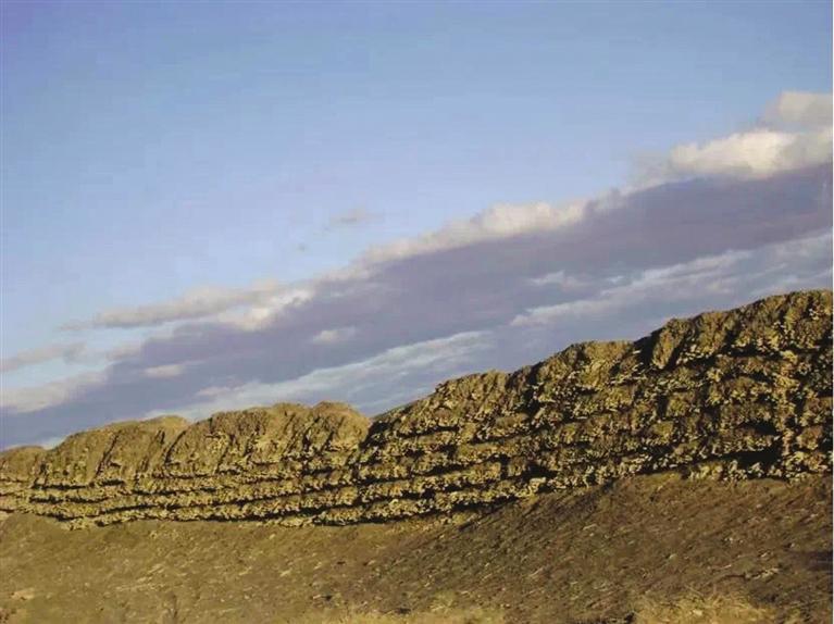 花海漢長城遺址位于玉門市花海鎮(zhèn)西泉村頭墩西側(cè)至二墩東側(cè),西起三墩,東至花海頭墩,全長約3.5公里。長城基寬約2.4米,用沙石、紅柳分層夯筑,最高部分保存有紅柳7層,是河西走廊漢代長城遺址中保存較完好的地段之一。(蘭州日?qǐng)?bào)社全媒體記者 王萬盈 高慧霞 文/圖)