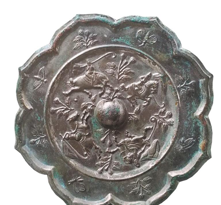隋唐時(shí)期是中國封建政治經(jīng)濟(jì)文化高度發(fā)展繁榮的時(shí)期,唐代社會(huì)經(jīng)濟(jì)全面發(fā)展,手工業(yè)各部門也都興旺發(fā)達(dá),青銅鑄造業(yè)中的銅鏡業(yè)尤為突出,無論造型、題材、紋飾、鑄造工藝,都突破了前代的模式,達(dá)到了中國古代銅鏡藝術(shù)的巔峰。唐鏡鏡型厚實(shí),方形鏡、菱花形鏡、葵花形鏡流行;紋飾題材多見瑞獸、飛鳥以及葡萄、花草等;瑞獸葡萄鏡最具特色,是中西文化融合的杰作。