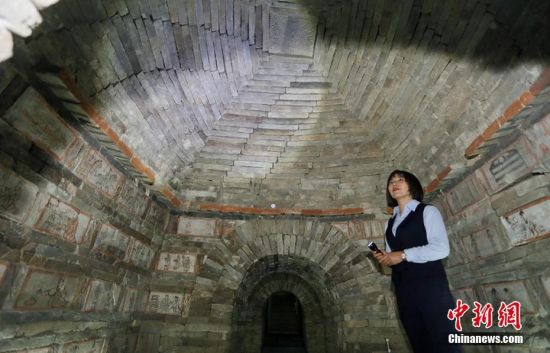 位于甘肅嘉峪關市的嘉峪關新城魏晉墓群,內有千余座魏晉古墓,從1972年起,先后發(fā)掘18座,其中9座為畫像磚墓。磚壁畫取材于現(xiàn)實生活,用連環(huán)畫的方式反映出了當時河西地區(qū)生活、生產、軍事、文化的真實情景,具有濃厚的生活氣息。目前只開放的六號墓,其壁畫內容豐富,具有很強的代表性。高展 攝