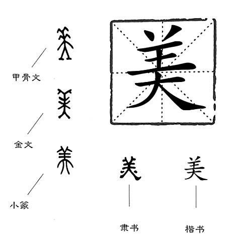但是,從字源上看,“美”似乎不是一只羊,而是一個人。“美”初見于商代甲骨文,在甲骨文中,“美”不是會意字,而是象形字,它的古字形像一個戴著頭飾站得端端正正的人。一個人若頭上裝飾著高聳彎曲的羽毛或類似的頭飾物,是不是很美呢?本來遠(yuǎn)古時的先民喜歡在頭上插上橫七豎八的頭飾,再聯(lián)想一下印第安酋長頭上那頂裝飾著長長羽毛的發(fā)冠,“美”的甲骨文字形簡直就是印第安酋長的簡筆畫。
