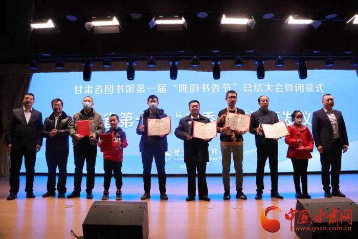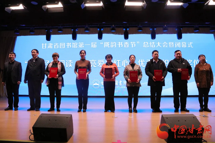 中國(guó)甘肅網(wǎng)12月28日訊(本網(wǎng)記者 張?zhí)m琴 通訊員 吳鵬)12月27日,歷時(shí)8個(gè)月的甘肅省圖書館第一屆隴韻書香節(jié)圓滿落幕。閉幕儀式上播放了第一屆“隴韻書香節(jié)”活動(dòng)總結(jié)短片和書香家庭宣傳短片,公布了“隴韻書香節(jié)”形象標(biāo)識(shí)(LOGO)方案,并為“甘肅省第一屆書香家庭”獲得者、“紅色經(jīng)典閱讀  點(diǎn)亮愛(ài)黨紅心”活動(dòng)獲獎(jiǎng)?wù)哳C獎(jiǎng)。