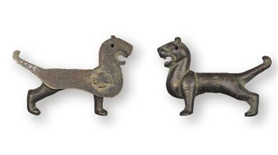 銅虎符(圖③)高4.7厘米、長(zhǎng)6.9厘米。虎圓豎耳,怒目張口,挺胸昂首,尾上翹,作奔走狀。符頭部有圓穿孔,背面有凸起的十字扣。符身正面陰刻篆書“永安府”字樣,背面陰刻楷書“右翊衛(wèi)”“右驍衛(wèi)”“永安四”“蘭豐二”等字樣。右翊衛(wèi)、右驍衛(wèi),官署名,為隋唐十六衛(wèi)中的兩衛(wèi)。隋初稱左右衛(wèi),隋煬帝時(shí)改為左右翊衛(wèi),所領(lǐng)軍士稱驍騎。館藏虎符出土于甘肅莊浪,是隋代府兵駐防莊浪的歷史見證,是研究隋代府兵制度的重要實(shí)物資料。