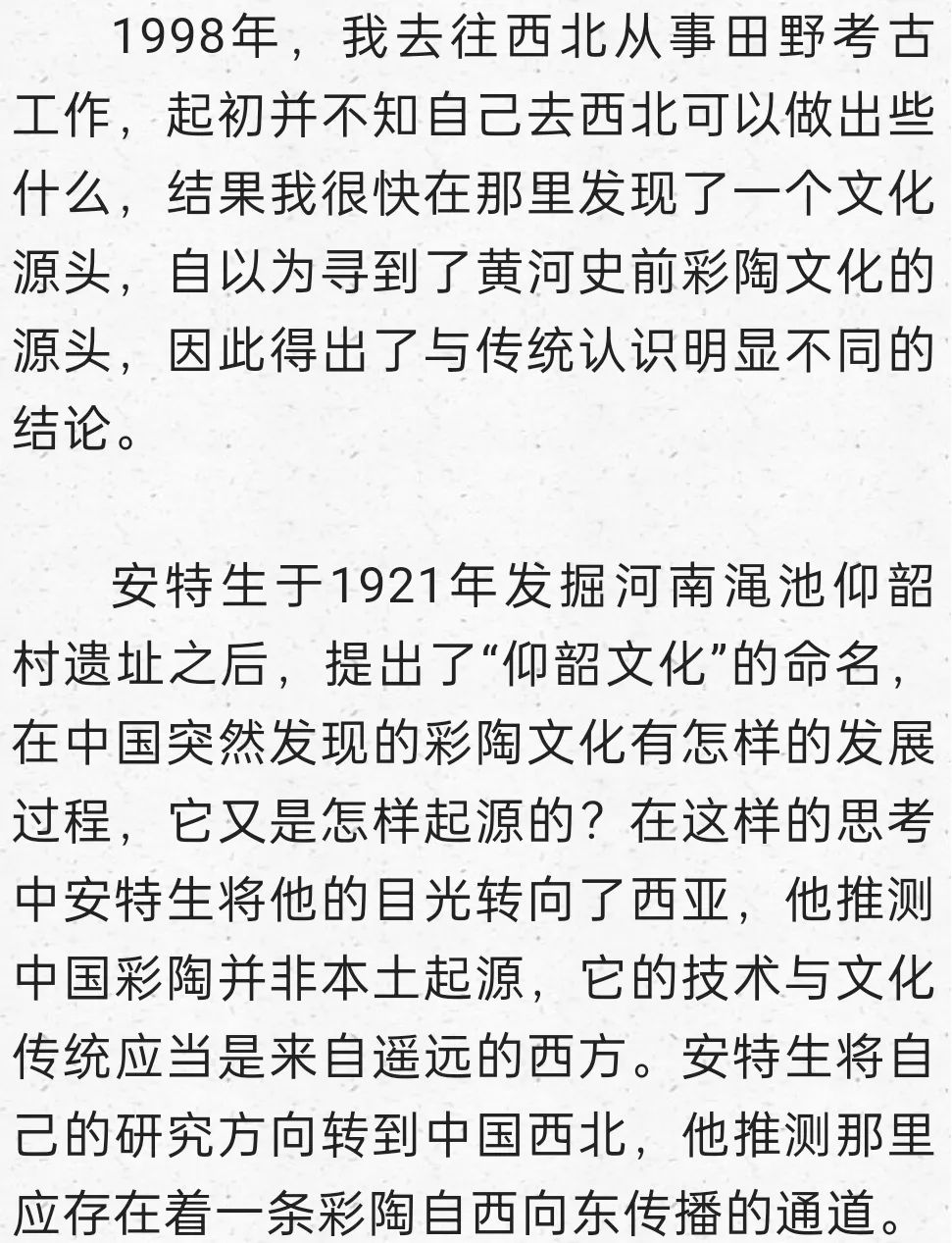 安特生從1923年開始沿黃河西行,去追溯仰韶文化和彩陶文化的源頭。他在甘肅和青海一帶發(fā)現(xiàn)了豐富的古文化遺存,發(fā)現(xiàn)了比中原數(shù)量更多的彩陶,這使得他流連忘返,一直在那里待了近兩個(gè)年頭。安特生發(fā)現(xiàn)六種考古學(xué)文化中都見到了彩陶,他認(rèn)為這些考古學(xué)文化處于新石器時(shí)代晚期到向青銅時(shí)代過渡的時(shí)期,絕對年代約在公元前3500年到1500年之間,包括仰韶在內(nèi)它們代表了6個(gè)發(fā)展階段,它們是齊家期、仰韶期、馬廠期、辛店期、寺洼期和沙井期,這便是他創(chuàng)建的“六期說”。將齊家期放在仰韶期之前,齊家期簡單而質(zhì)樸的彩陶紋飾,被認(rèn)定是彩陶開始出現(xiàn)的證據(jù)。