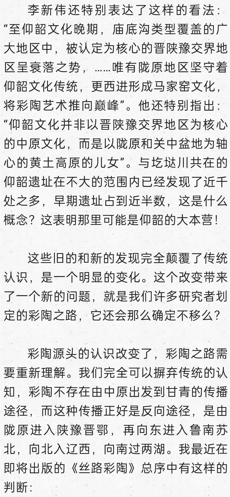 在這里明確提出到甘青尋找仰韶文化的正源,后來我又寫成《秦安大地灣遺址彩陶研究》,討論甘青彩陶的序列,也表達(dá)了類似觀點(diǎn):“甘肅及青海東部地區(qū)在距今6000年前左右,就已經(jīng)是仰韶文化的分布區(qū)域,馬家窯文化彩陶的來源應(yīng)當(dāng)就在這個(gè)本土區(qū)域,應(yīng)當(dāng)就是仰韶時(shí)期的廟底溝文化。從文化的分布與地層堆積關(guān)系找到了甘肅地區(qū)考古學(xué)文化明確的傳承關(guān)系,由彩陶紋飾演變的考察也能尋找到傳承的脈絡(luò)”。