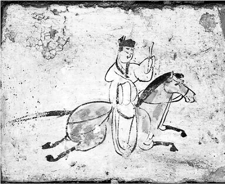 這一時(shí)期,自天子以至百官士庶,除乘車外還普遍騎馬。西晉時(shí)北方出現(xiàn)上馬時(shí)所踩的單馬鐙,南北朝后期又出現(xiàn)嚴(yán)格意義上的雙馬鐙。馬鐙的使用能減輕人們騎馬的體力消耗,有利于控制馬匹。這一時(shí)代的低級(jí)官員和百姓出行還乘驢、騾,甘肅等西北地區(qū)少數(shù)民族多乘駝,運(yùn)載貨物主要用牛車。漢地民眾出行,仍然是安步當(dāng)車。嘉峪關(guān)魏晉墓五號(hào)墓的《驛使圖》,畫面中一個(gè)郵驛使騎在馬上,頭戴進(jìn)賢冠,身穿右襟寬袖衣,足蹬長(zhǎng)靴,左手舉木牘文書,右手持馬韁,驛騎四蹄騰空,飛奔直前。這幅畫再現(xiàn)了當(dāng)時(shí)甘肅地區(qū)驛使馳送文書的情景,也是我國(guó)古代郵驛使較早的形象資料。