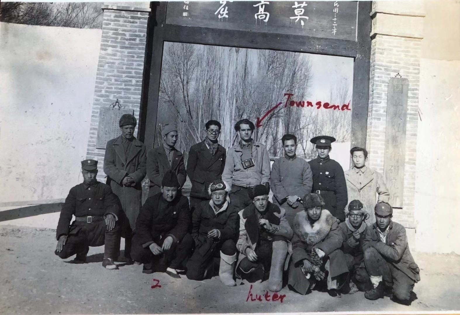 1945年4月張官廉(前排左三)陪同英國議員、英國消費(fèi)合作社總社負(fù)責(zé)人胡特(后排中)考察山丹培黎學(xué)校期間在敦煌莫高窟前合影