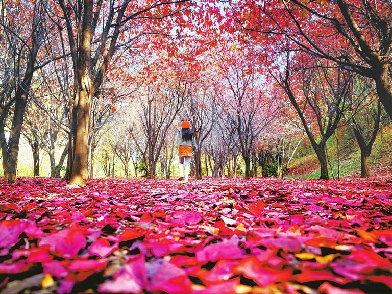 深秋的天水市秦州區(qū)南郭寺大景區(qū)被豐富多彩的顏色包圍,蜿蜒曲折的道路兩旁,各種樹木色彩斑斕、美不勝收。一陣微風吹過,五彩斑斕的樹葉落到山間的步道上,鋪就了一層“多彩絢麗的地毯”。漫步其中,一幅人與自然各美其美、美美與共的美麗畫卷依山鋪就開來,迷醉游人。那一刻,詩圣杜甫《秦州雜詩》秋天里的南郭寺,在陽光的輝映下,滿目秋色皆是美景、皆是詩意。