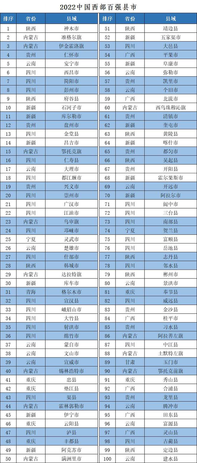 《中國(guó)西部地區(qū)縣域發(fā)展監(jiān)測(cè)報(bào)告》由競(jìng)爭(zhēng)力智庫(kù)、北京中新城市規(guī)劃設(shè)計(jì)研究院等機(jī)構(gòu)聯(lián)合編制,監(jiān)測(cè)評(píng)價(jià)對(duì)象為西部12個(gè)?。ㄗ灾螀^(qū)、直轄市)的全部縣域單位,從經(jīng)濟(jì)規(guī)模、人民生活、經(jīng)濟(jì)活力、發(fā)展質(zhì)量等四個(gè)方面進(jìn)行評(píng)價(jià),四個(gè)分項(xiàng)指數(shù)合成競(jìng)爭(zhēng)力指數(shù)。其中,縣(縣級(jí)市、自治縣、旗、自治旗、特區(qū))競(jìng)爭(zhēng)力指數(shù)前100名為“中國(guó)西部地區(qū)綜合競(jìng)爭(zhēng)力百?gòu)?qiáng)縣市”,簡(jiǎn)稱“中國(guó)西部百?gòu)?qiáng)縣市”或“西部百?gòu)?qiáng)縣”;市轄區(qū)競(jìng)爭(zhēng)力指數(shù)前100名為“中國(guó)西部地區(qū)綜合競(jìng)爭(zhēng)力百?gòu)?qiáng)區(qū)”,簡(jiǎn)稱“中國(guó)西部百?gòu)?qiáng)區(qū)”或“西部百?gòu)?qiáng)區(qū)”。今年,課題組在開展西部地區(qū)縣域發(fā)展監(jiān)測(cè)評(píng)價(jià)的基礎(chǔ)上,還聯(lián)合有關(guān)單位和專家,分區(qū)域、分類型總結(jié)了“2022中國(guó)西部地區(qū)縣域高質(zhì)量發(fā)展典型案例”,準(zhǔn)格爾旗、平果市、仁壽縣、彭州市、瀘縣、吳起縣、玉門市、開陽(yáng)縣、大竹縣、彬州市、成都市雙流區(qū)、西安市雁塔區(qū)、昆明市官渡區(qū)、包頭市昆都侖區(qū)、克拉瑪依市克拉瑪依區(qū)、貴陽(yáng)市觀山湖區(qū)、南寧市青秀區(qū)、蘭州市城關(guān)區(qū)、西寧市城西區(qū)、銀川市興慶區(qū)等20個(gè)縣(市、區(qū))入選典型案例名單,供全國(guó)交流學(xué)習(xí)。