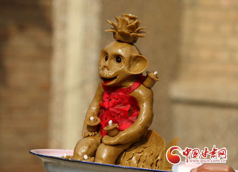 大面猴身上的面燈是專供一對新人來點(diǎn)的,所以面猴的做工尤為精心,在面猴的眼睛上還鑲嵌了明溜溜的黑豆,在胸前系著紅肚兜,看上去憨態(tài)可掬。