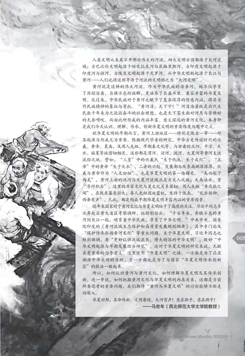“黃河與華夏文明”系列文章(共9篇),由《博覽群書》編輯部邀約西北師范大學(xué)文學(xué)院馬世年、杜志強等著名專家策劃、組稿,作者有馬世年、杜志強、張景平、延娟芹、張存良、黑金福、劉陽杰、蘭蓓蓓等,分別刊發(fā)于《博覽群書》2022年3期、9期。系列文章著眼黃河文化,呼應(yīng)中央關(guān)于研究黃河文化的號召,探討華夏文明在黃河流域的發(fā)展、發(fā)生與傳承、創(chuàng)新;同時,欄目通過精準立意、深入考證和生動表達,卓有成效地推介和普及了黃河文化,深化了國人對黃河文化的認識。已經(jīng)探討的相關(guān)論題有:歷史上關(guān)于黃河起源的爭議,黃河文化的內(nèi)涵,先周文化,秦早期文化,民族文化,西王母文化,絲路文化等。據(jù)《博覽群書》雜志介紹,鑒于這一主題的人文價值和巨大影響,編輯部將和學(xué)界更加密切配合,加強相關(guān)欄目,講好學(xué)術(shù)故事,推動黃河文化研究形成新局面和新氣象。