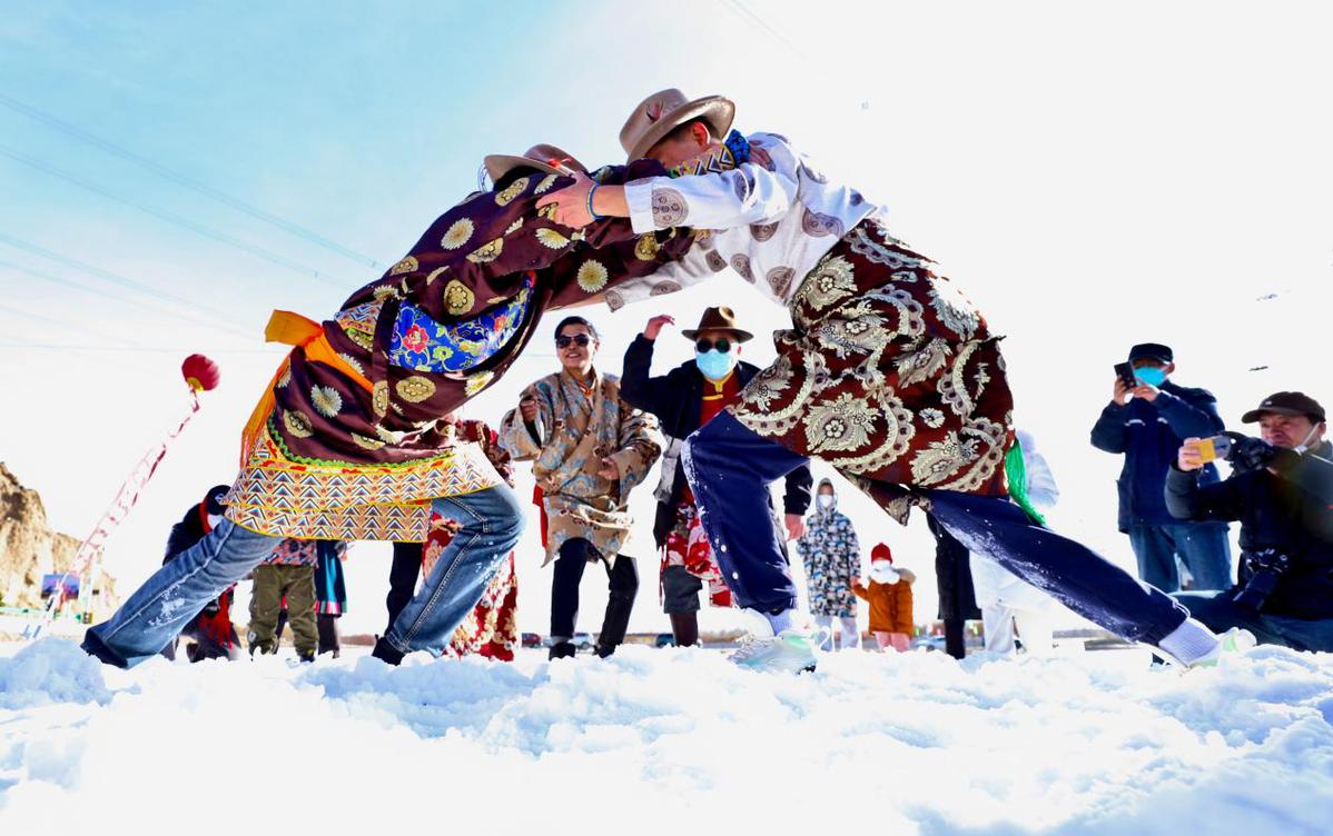 當(dāng)日,“相約文殊山樂(lè)享冰雪趣”,藏族群眾在冰雪運(yùn)動(dòng)場(chǎng)上進(jìn)行雪地鍋莊舞、頂杠子、拔棍、拉爬牛、戶(hù)外徒步、雪地摔跤、雪圈滑行追逐、滑冰、電商直播等多項(xiàng)比賽,吸引了周邊群眾和甘肅酒泉、嘉峪關(guān)等地的萬(wàn)名游客前來(lái)參觀游覽和參與比賽。