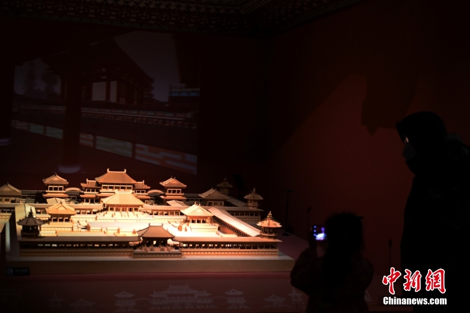 游客正在參觀“千年?duì)I造——敦煌壁畫中的建筑之美”特展上出自莫高窟第419窟的火焰券方形龕模型。(中新社記者 李亞龍 攝)