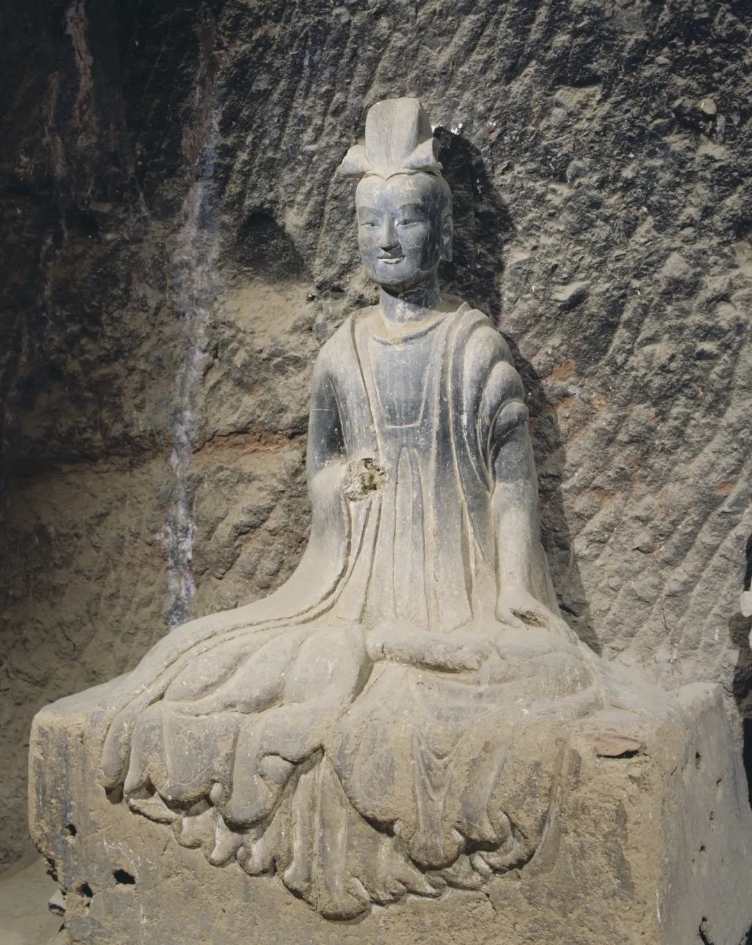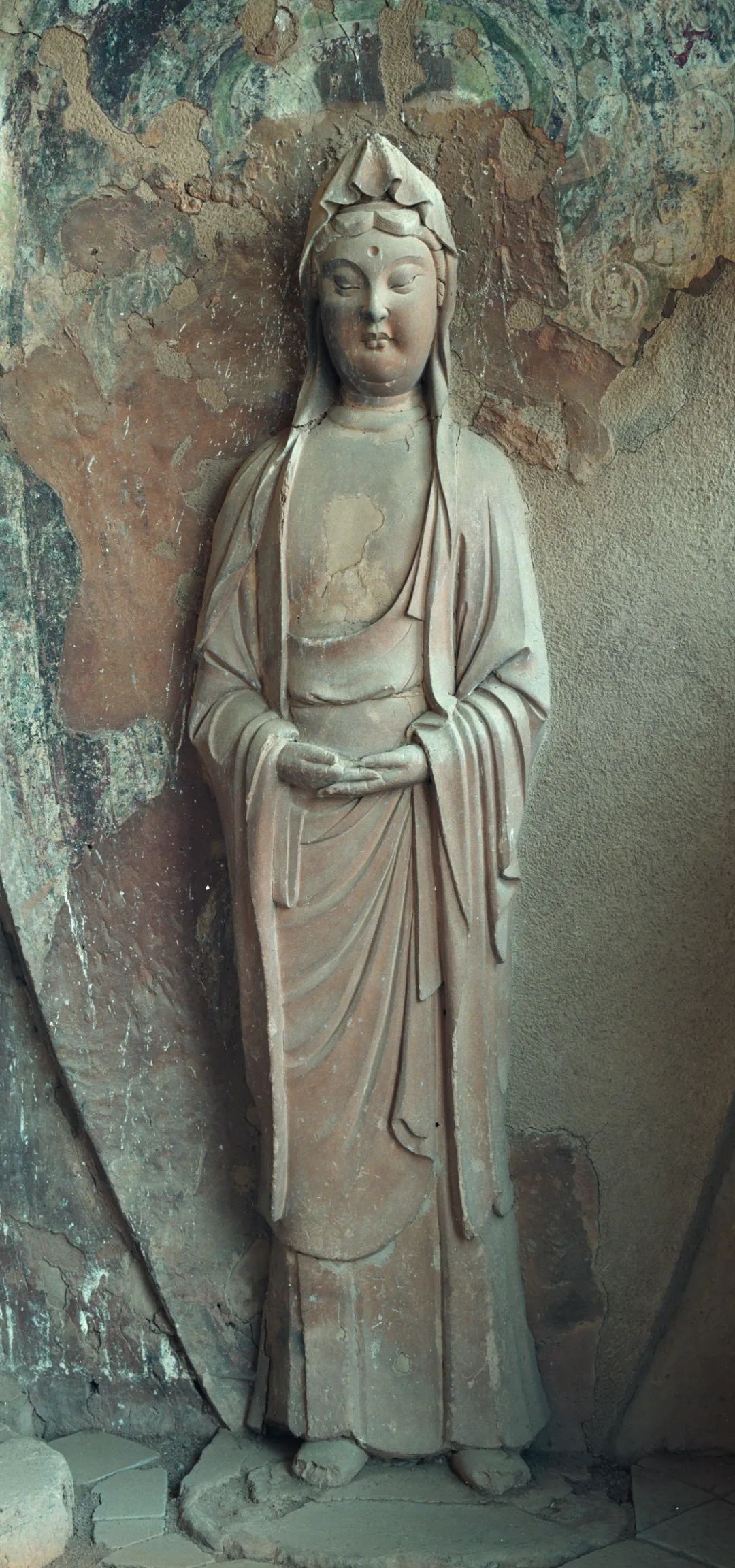 從題材上看,以單尊佛、菩薩、力士等為主,風(fēng)格上更具有寫(xiě)實(shí)性。造像面相橢圓飽滿,斜眉吊目,懸鼻小口,表情森嚴(yán)、凝重,服飾簡(jiǎn)潔、質(zhì)樸,寬博厚重,極富質(zhì)感。其中佛低平螺髻,前置肉髻珠,身穿垂領(lǐng)袈裟。菩薩束發(fā)高髻或戴風(fēng)帽,眉目慈祥,身材比例協(xié)調(diào)、準(zhǔn)確。力士表情生動(dòng)傳神,體形孔武雄健,充滿陽(yáng)剛之氣,給人以強(qiáng)烈的力量和威武感;這段時(shí)間造像前衰后盛也與當(dāng)時(shí)秦州所處環(huán)境有密切關(guān)系。
