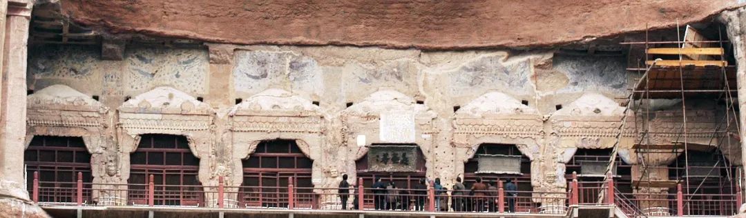 代表性窟龕主要有第4、9、12、15、22、26、27、141等窟,主要集中在東崖。仿殿堂式窟在這一時(shí)期達(dá)到頂峰,如東崖上部的第4窟,俗稱(chēng)“上七佛閣”或“散花樓”,系大型廡殿頂,前廊后室、七間八柱式結(jié)構(gòu),面闊30.48米、進(jìn)深8.00米、通高16.00米,平棋、斗栱、額枋、瓦壟、正脊、鴟吻等建筑構(gòu)件一應(yīng)俱全。后室由七個(gè)裝飾華麗的帳形大龕組成,富麗堂皇。