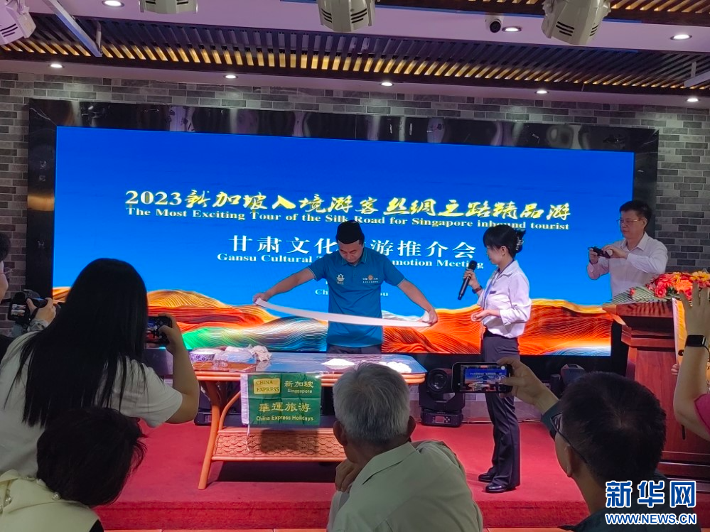 推介會上,甘肅文化和旅游推介大使向新加坡游客詳細(xì)介紹了甘肅多元且極富特色的文化旅游資源;蘭州拉面師傅為大家現(xiàn)場表演了非遺美食牛肉面的拉面絕技;新加坡南方藝術(shù)研究會合唱團還進行了合唱表演。