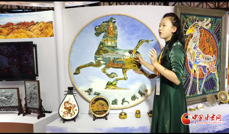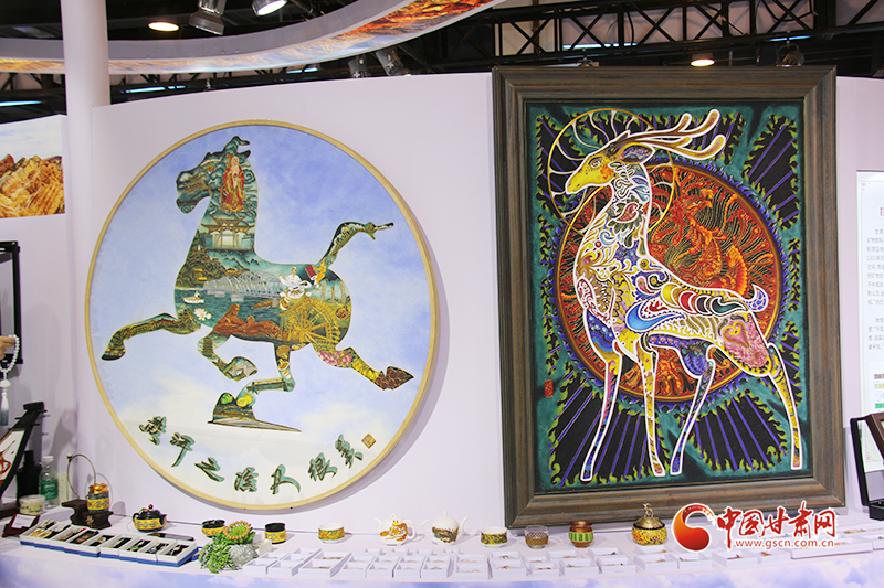 和阮琳的刻葫蘆一樣,由甘肅李明?,m瑯壁畫文化傳承發(fā)展有限公司展呈的“黃河之濱也很美”和靈動的九色鹿等充滿敦煌元素的掐絲琺瑯壁畫流光溢彩,精美絕倫,參觀問詢著絡繹不絕。