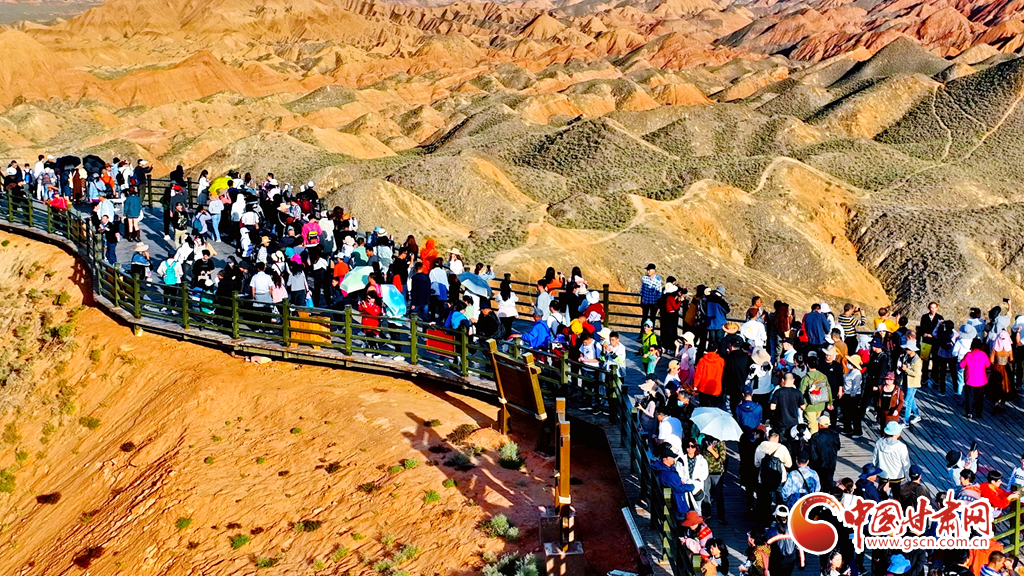 張掖七彩丹霞地貌群以其層理交錯(cuò)、巖壁陡峭、氣勢(shì)磅礴、造型奇特、色彩斑斕而稱奇。2020年,國家文化和旅游部確定張掖七彩丹霞景區(qū)為國家5A級(jí)旅游景區(qū);同年,張掖地質(zhì)公園獲批“聯(lián)合國教科文組織世界地質(zhì)公園”。據(jù)七彩丹霞景區(qū)管委會(huì)統(tǒng)計(jì),當(dāng)日是中秋國慶假期第二天,該景區(qū)游客量達(dá)29000多人?!?/p>