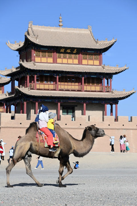 2023年8月7日,游客在嘉峪關(guān)關(guān)城外騎駱駝。 新華每日電訊記者 范培珅 攝