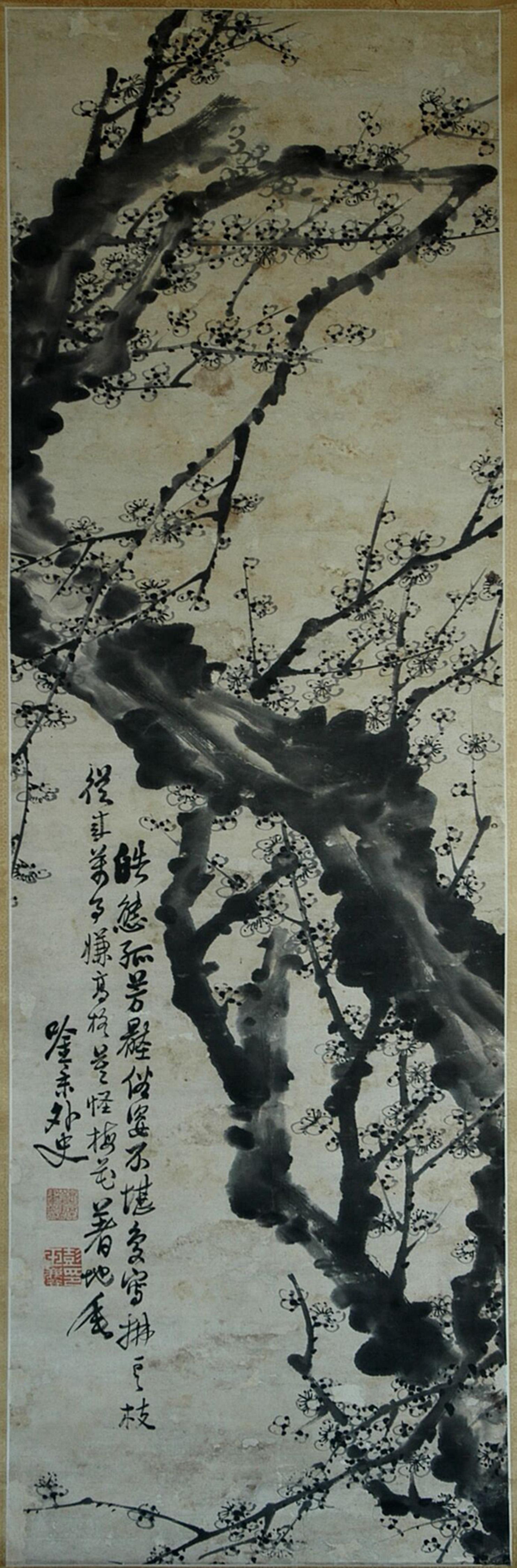 彭玉麟一生所作梅花不下萬(wàn)幅,清水縣博物館館藏的這幅梅花圖屬館內(nèi)舊藏,其來(lái)歷已無(wú)從考證。這幅立軸梅花圖長(zhǎng)133厘米,寬42厘米。畫(huà)面上,一棵下不見(jiàn)根底的老梅,蜿蜒盤旋凌空而上,好似神龍擺尾,顯得古拙蒼勁,點(diǎn)點(diǎn)梅花用寫(xiě)意筆法一揮而就。畫(huà)作不著顏色,老干繁枝,遒勁如鐵,寒梅點(diǎn)點(diǎn),暗香浮動(dòng),散發(fā)著濃厚的文人畫(huà)氣息。