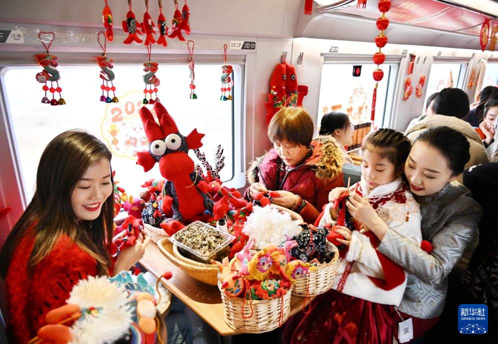 1月30日,旅客在高鐵列車上體驗非遺文化。