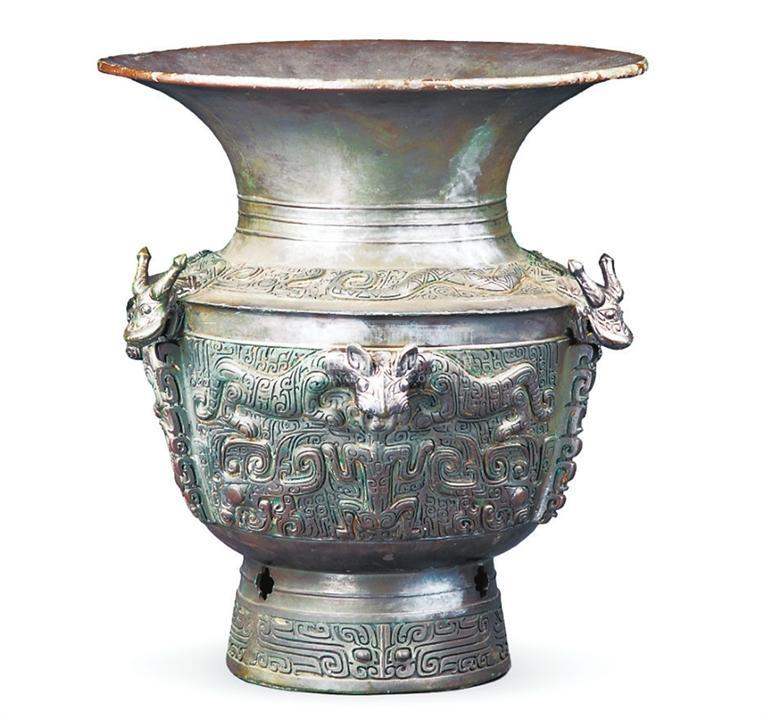 中國(guó)國(guó)家博物館收藏的龍虎紋青銅尊,高50.5厘米,重26.2千克,為一件體形較高大的盛酒器。青銅尊肩部以圓雕和浮雕相結(jié)合,塑造3條生動(dòng)的蟠龍形象,龍身蜿蜒,龍首探出,額有雙角,闊吻巨口,兩眼大睜。腹部紋飾為一個(gè)虎頭兩個(gè)虎身,虎口之下有一人形,人頭銜于虎口之中?;⑸硐路揭造槔鉃榻?,飾兩夔龍相對(duì)組成的獸面。從主體花紋看,龍、虎、人造型莊嚴(yán)穩(wěn)重、奇特神秘,特別是龍頭和虎頭用澆鑄法從外壁突兀凸起,雄健粗獷,比起用高浮雕法更具有一種威武逼人的悍氣。龍虎尊圓形大口表示上天,肩部神龍游蕩于空中;猛虎張牙舞爪守護(hù)大地。龍虎尊的鑄造采用十八塊母范經(jīng)兩次焊接而成,渾然一體,毫無(wú)痕跡。整器工藝精湛,花紋線條洗練,是商代青銅器中的精品。