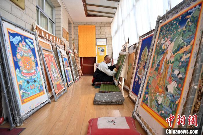 圖為交巴加布展示以拉卜楞寺為主題的唐卡作品。交巴加布不僅繼承了傳統(tǒng)唐卡技藝,更在創(chuàng)新中展現(xiàn)了個(gè)人特色。他結(jié)合現(xiàn)代審美和繪畫技巧,使作品既保留了傳統(tǒng)的韻味,又具有鮮明的現(xiàn)代氣息。這種獨(dú)特的藝術(shù)風(fēng)格使他的作品在眾多唐卡中脫穎而出,成為藏族民眾和藝術(shù)愛好者爭(zhēng)相收藏的藝術(shù)珍品。九美旦增 攝