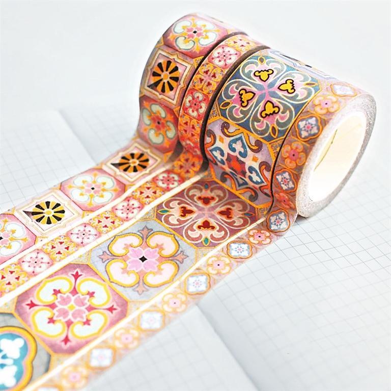 紋樣膠帶——在眾多文創(chuàng)產(chǎn)品中,膠帶的銷售或人氣排行榜靠前。紙膠帶雖是個小物件,但藝術(shù)化的紙膠帶卻能夠滿足多種需求,適應(yīng)多層次人群的需求。圖形多來自器物上的印刻、繪制圖案,或抽象或具體。這也就體現(xiàn)了兩種效果,一種是文藝范,另一種是趣味感,來自重構(gòu)傳統(tǒng)的高大上,消解歷史的審美觀。設(shè)計靈感來自中國傳統(tǒng)紋樣,融合敦煌元素,有層次的色彩斑斕,圖案以及細(xì)節(jié)都恰到好處。