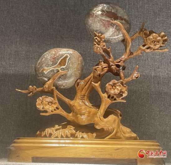 還有兩塊看似普通的小石頭,用樹根雕成的花架支撐起來,上方的石頭似圓月當(dāng)空,下面的一塊花紋石,花紋類似一只鳥,這件作品起名“枝頭戀歌”,不得不佩服創(chuàng)作者的浪漫情懷。