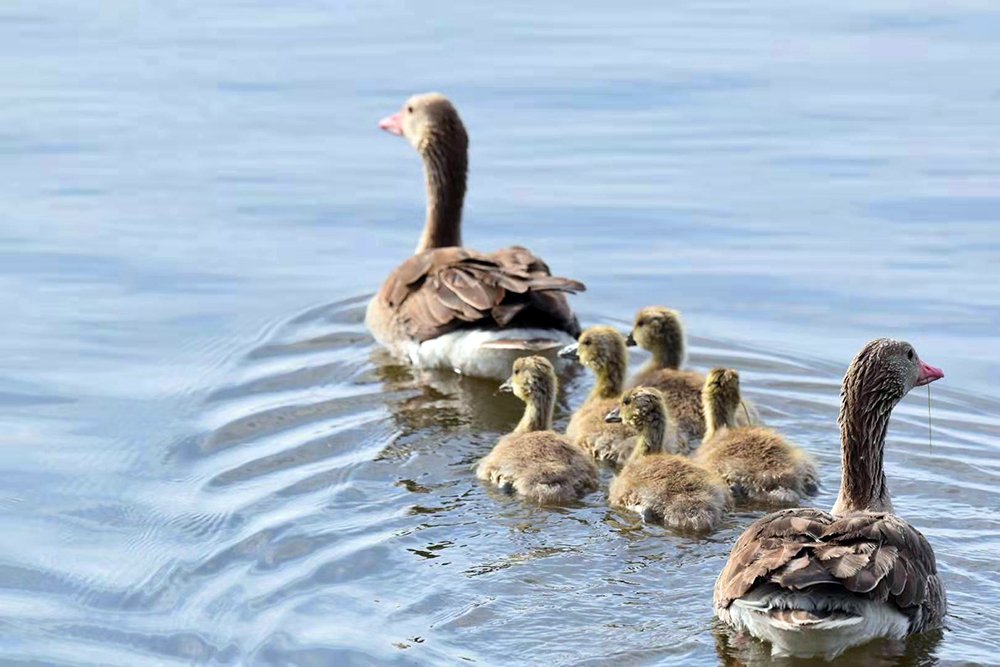 灰雁是鴨科雁屬鳥類,屬國家重點(diǎn)保護(hù)的“三有”鳥類,也是陽關(guān)濕地的夏候鳥。監(jiān)測(cè)顯示,在陽關(guān)濕地繁殖的灰雁家族有100多只。每年3月下旬遷飛至陽關(guān)濕地,4月中旬筑巢繁殖,5月上旬孵化出雛鳥4至5只?;已銥?ldquo;一夫一妻”制,孵化由雌鳥單獨(dú)承擔(dān),雄鳥在巢附近負(fù)責(zé)警戒。待雛鳥破殼出窩后,則由雌雄共同撫育。灰雁生性膽小、機(jī)警,小寶寶溜達(dá)時(shí),雌鳥在前開道,雄鳥負(fù)責(zé)斷后,小寶寶上岸覓食嫩草芽時(shí),雄鳥仍然負(fù)責(zé)警戒,若有危險(xiǎn)立刻鳴叫警示。故而,近距離拍攝灰雁雛鳥是比較困難的。