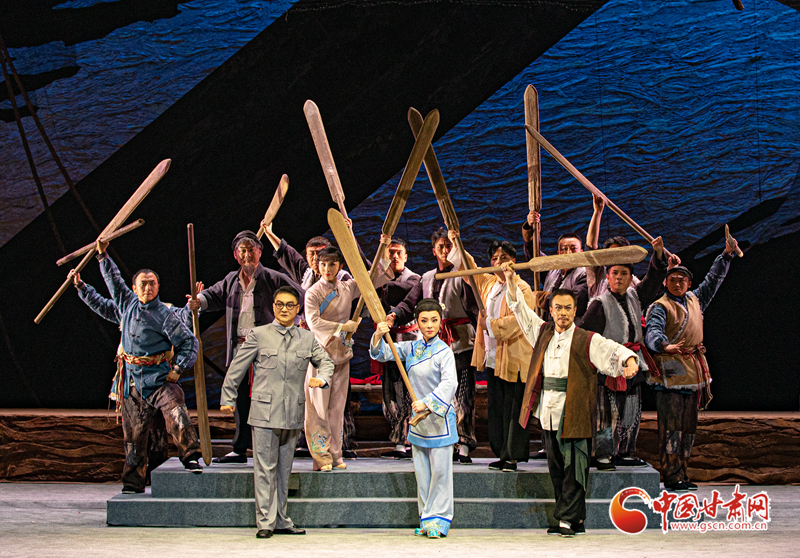 隴劇《大河東流》于19日晚在甘肅黃河劇院成功首演。該劇以20世紀30年代末抗戰(zhàn)為背景,運用具有地方特色的隴劇形式,生動地描繪了大西北黃河邊的一群筏客子在國家危難之際,如何放下個人恩怨,團結(jié)起來支援抗戰(zhàn),組成水上大型運輸隊,將大量物資安全送達抗戰(zhàn)前線,創(chuàng)造了“羊皮筏子賽軍艦”的傳奇故事。(甘肅省隴劇院供圖)