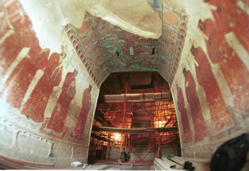 在中國(guó)科學(xué)院蘭州分院沙漠研究所的計(jì)算機(jī)房,操作人員輕輕一按,電腦屏幕上顯示出莫高窟四十五窟主室佛龕的畫面,只見壁畫色彩絢麗奪目,佛像栩栩如生,連臉上淡淡的眉毛與胡須亦清晰可見。由敦煌研究院等單位聯(lián)合進(jìn)行的“敦煌壁畫計(jì)算機(jī)存貯與管理信息系統(tǒng)研究”利用計(jì)算機(jī)有效保存和真實(shí)再現(xiàn)敦煌壁畫,使這一藝術(shù)瑰寶永駐人間成為現(xiàn)實(shí)。圖為莫高窟220窟整體揭取的第二層壁畫經(jīng)搬遷后重新固定。新華社記者彭張青攝(1996年11月24日發(fā))