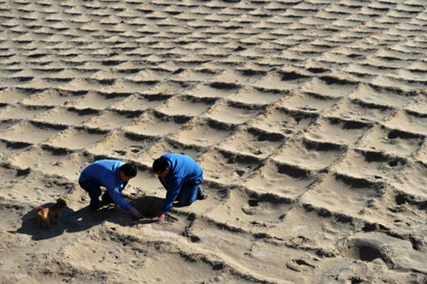 記者從敦煌研究院了解到,到2014年,經(jīng)過70年持續(xù)風(fēng)沙治理,風(fēng)沙對(duì)敦煌莫高窟的危害顯著降低,進(jìn)入窟區(qū)年積沙量減少85%以上。據(jù)敦煌研究院保護(hù)所副所長(zhǎng)汪萬福介紹,在幾代治沙人的努力下,莫高窟頂已形成由防沙障阻沙、沙生植物林帶擋沙、麥草方格沙障固沙和礫石壓沙組成的風(fēng)沙防治綜合體系,極大減緩了風(fēng)沙對(duì)敦煌壁畫和塑像等文物的危害,改善了窟區(qū)生態(tài)環(huán)境。圖為2014年8月29日,兩名工作人員檢查用于固沙的麥草方格。新華社記者陳斌攝