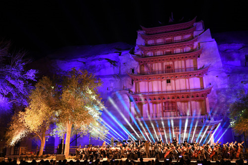 2016年9月15日,首屆絲綢之路(敦煌)國(guó)際文化博覽會(huì)系列活動(dòng)之一的敦煌莫高窟1650周年紀(jì)念音樂會(huì)在莫高窟舉行。著名指揮家陳燮陽、特邀音樂家趙聰?shù)人囆g(shù)家奉上了具有絲綢之路沿線諸國(guó)特色的經(jīng)典曲目,2000余名觀眾在莫高窟九層樓廣場(chǎng)前追憶絲綢之路的璀璨歷史,聆聽穿越古今的藝術(shù)交響。