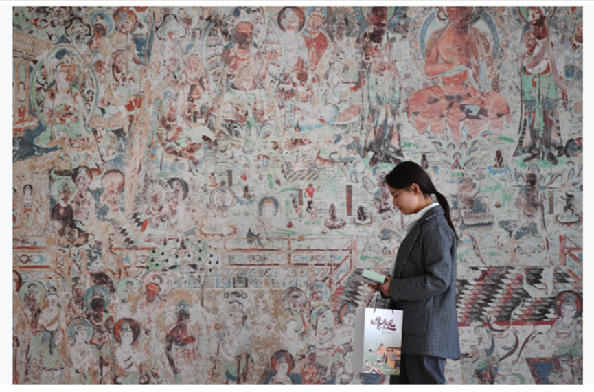圖為敦煌研究院文物數(shù)字化保護(hù)團(tuán)隊(duì)創(chuàng)意營(yíng)銷人員廖雪婷從一幅高保真復(fù)制壁畫前走過(2023年4月25日攝)。新華社記者陳斌攝