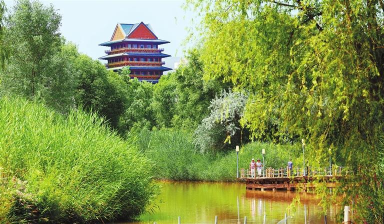 隨著黃河水位的變動,濕地四季景色各異。亭臺樓閣、小橋流水,漫步其間讓市民和游客領(lǐng)略到黃河濕地的獨特風貌。