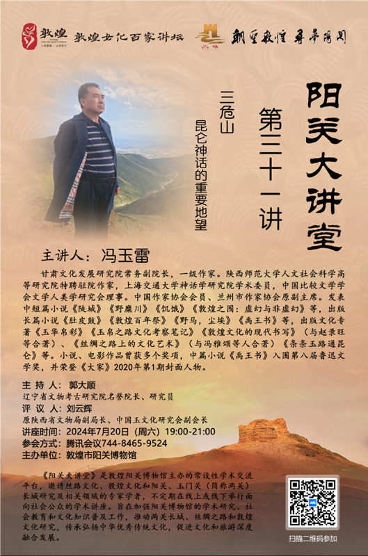 中國(guó)甘肅網(wǎng)7月18日訊 7月20日,西北師范大學(xué)甘肅文化發(fā)展研究院常務(wù)副院長(zhǎng)、一級(jí)作家、玉文化學(xué)者馮玉雷將在線(xiàn)進(jìn)行題為《三危山:昆侖神話(huà)的重要地望》的講座。本次講座由敦煌陽(yáng)關(guān)博物館主辦,為“敦煌文化百家講壇”第31講,遼寧省文物考古研究院名譽(yù)院長(zhǎng)、資深考古學(xué)家、玉學(xué)家郭大順研究員擔(dān)綱主持,陜西省文物局原副局長(zhǎng)、中國(guó)玉文化研究會(huì)副會(huì)長(zhǎng)、資深玉學(xué)家劉云輝教授擔(dān)綱評(píng)議。