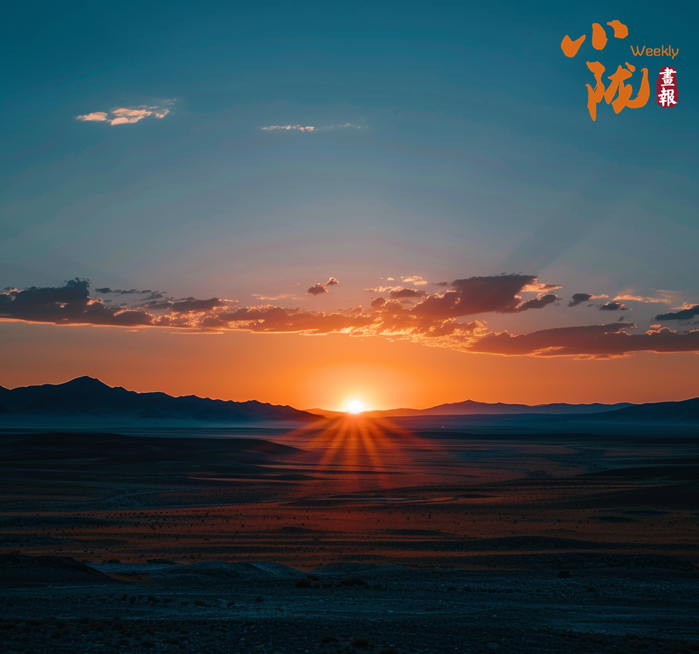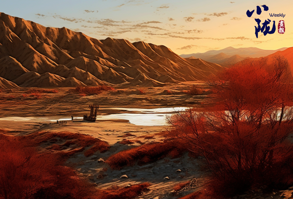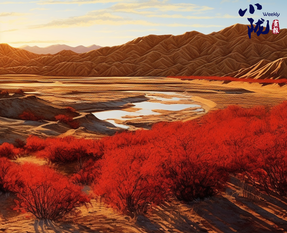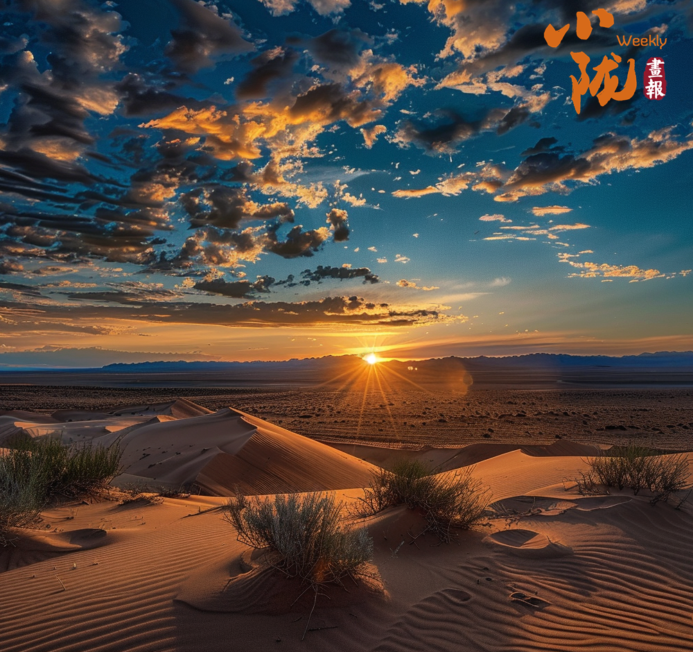 沙漠的沙粒在晚霞的映射下變得金黃而溫暖,仿佛覆蓋了一層光暈。遠(yuǎn)處的山峰也被晚霞點亮,宛如一座座火焰般迎接著夜晚的到來。