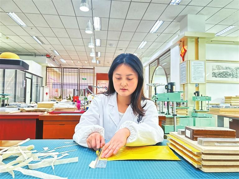 今年23歲的羅雪瑞是保護中心里的古籍修復師。她告訴記者:“在學校時學的是工藝美術(shù)品設(shè)計專業(yè)書畫裝裱方向,需要很強的動手能力,這為古籍修復工作打下了很好的基礎(chǔ)。”