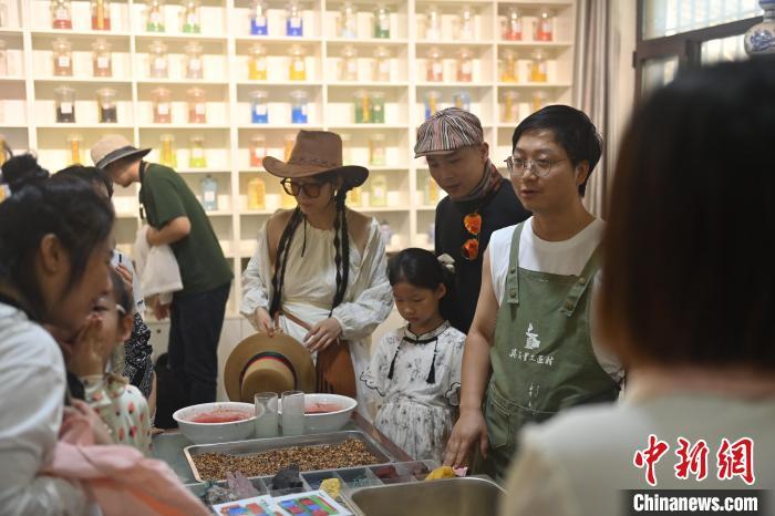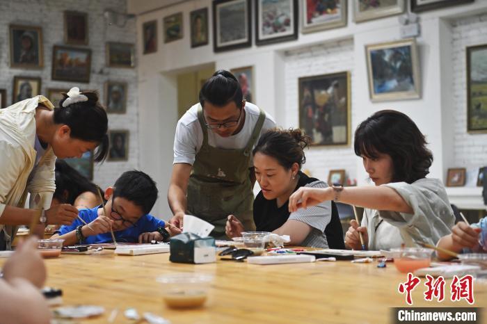 8月20日,甘肅敦煌莫高里工匠村內(nèi),研學(xué)導(dǎo)師向?qū)W員介紹敦煌礦物質(zhì)顏料。工匠村開設(shè)了泥板畫、彩繪、雕塑制作、剪紙、農(nóng)耕體驗等課程,現(xiàn)已發(fā)展成為一個集敦煌文化講堂、壁畫書法研習(xí)、美術(shù)設(shè)計、彩塑制作教學(xué)、篆刻藝術(shù)、傳統(tǒng)釀酒體驗、農(nóng)業(yè)產(chǎn)業(yè)發(fā)展等于一體的多功能實訓(xùn)基地。中新社記者 李亞龍 攝