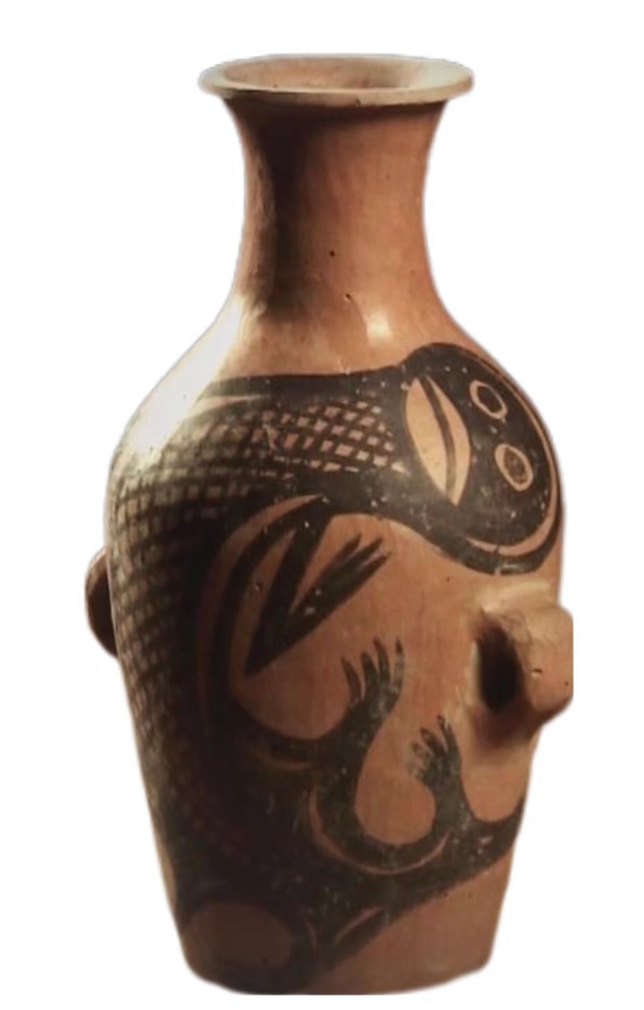 這件鯢魚紋彩陶瓶為泥質紅陶,高18.5厘米,口徑寬5.7厘米,底徑7厘米,腹徑14厘米,重430克。陶瓶最顯著的特征是在腹部繪有動物圖紋。動物的身子呈蜷曲狀,尾巴向上翹舉,交于頭上。臉似人面,雙眼圓睜而有神。嘴巴寬闊,顎下有須,頭頂兩側有伸出的節(jié)肢狀腮。奇怪的是,它只有一對前肢,肢端有張開的四肢。陶瓶身上繪制有網格狀的線紋。線條流利而生動,變化豐富,展現(xiàn)出了熟練自如的繪畫技巧。從鯢魚圖案的繪制來看,紋飾用筆鋒畫作的線條遒勁有力,頓挫有致。粗細不同的線條之間,還凸顯出了圖紋部位的主次。彩陶的出現(xiàn),也似乎在見證著先祖?zhèn)冊谑庝离x居、不常厥邑的歲月中所經歷的那些艱難生活。