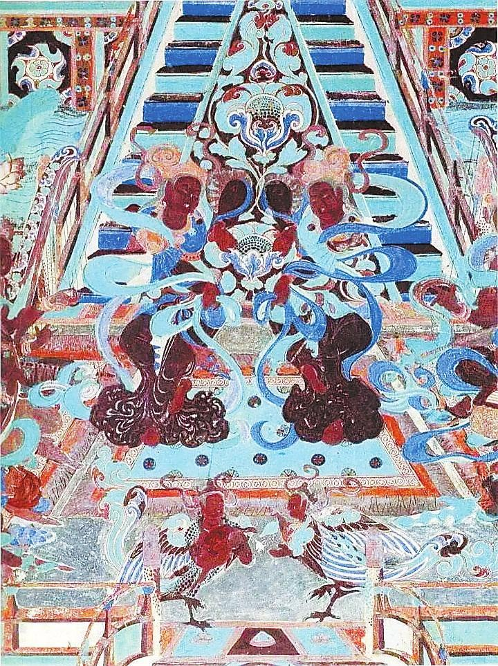 敦煌莫高窟,窟窟有壁畫,拼接起來長達45000多平方米,有世界上“最大畫廊”之稱。這些壁畫中,幾乎每幅都有舞蹈形象,如在窟頂、龕楣、藻井遨游的飛天,憑欄上的天宮伎樂,經(jīng)變畫中的娛佛、敬佛的獻舞者——伎樂天,出行圖中跳著具有濃郁生活氣息的世俗樂舞,以及富有舞蹈美感的彩塑菩薩、天王力士等,琳瑯滿目,精妙絕倫。這些舞蹈形象充分反映了從十六國北朝至元代千余年來不同歷史時期的舞蹈服飾、形態(tài)、風貌,為我們挖掘、整理、弘揚中華民族舞蹈文化提供了十分珍貴的形象資料。