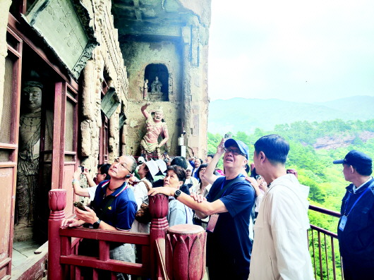 活動當(dāng)天,來自臺灣文博領(lǐng)域的專家學(xué)者一行,懷著對古老文化的敬仰與憧憬,在麥積山石窟感受石窟藝術(shù)的獨特魅力、在天水工業(yè)博物館探尋工業(yè)發(fā)展的歷史脈絡(luò)、在伏羲廟體悟中華始祖文化的博大精深、在天水市博物館領(lǐng)略豐富的歷史文物承載的歲月記憶、在天水古城品味古色古香的韻味與風(fēng)情……一系列豐富多彩的文化交流活動,讓他們近距離感受到了古城天水的風(fēng)景名勝、文化遺產(chǎn)保護(hù)傳承及山川風(fēng)物。