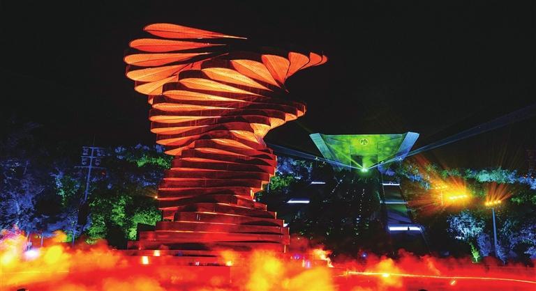 秋日的金川國家礦山公園樂聲悠揚(yáng)、光影迷離。夜晚,伴隨著動(dòng)人的旋律,絢爛的光影投射到主界碑“龍首魂”上,金昌元素生動(dòng)地展現(xiàn)在眼前,“鎳都之光”文化展演為旅客帶來了一場視覺盛宴。