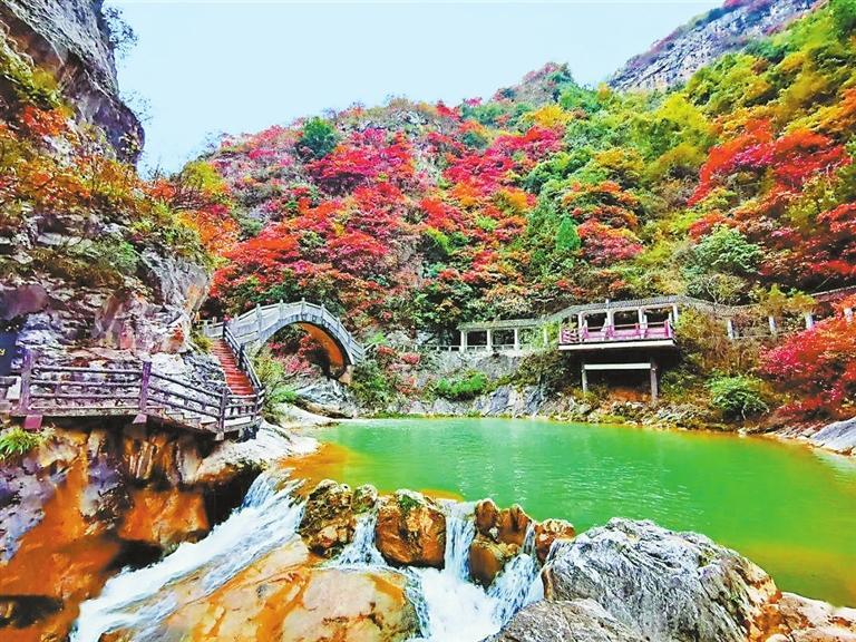 一路前行,途中不斷有紅葉映入眼簾,賞心悅目。這些紅葉伴著秋雨,疊映在綠樹叢中,五彩爛漫,紅綠相擁,顯得更加?jì)擅暮蜖N爛。最愜意路邊的一簇簇紅葉洋洋灑灑,昂揚(yáng)向上,隨手采摘一片,細(xì)細(xì)觀賞,那紅葉上的雨滴晶瑩剔透,叫人喟嘆不是鮮花勝鮮花,更覺秋色勝春光。