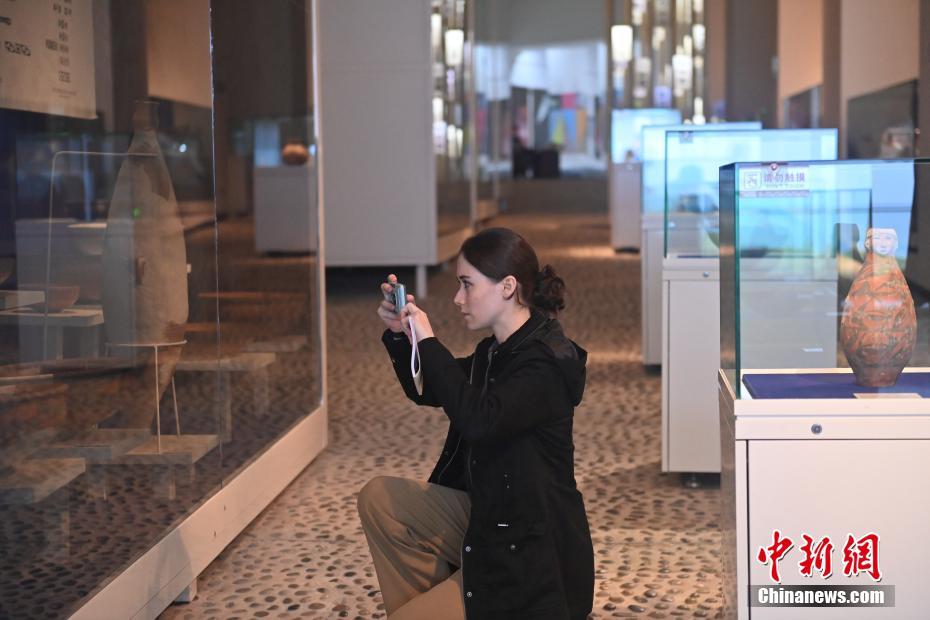 ?。保霸拢玻踩眨玻埃玻辞嗄隄h學家研修計劃甘肅班團隊22個國家的青年漢學家,走進甘肅省天水市秦安縣大地灣遺址參觀并進行專題研修。大地灣遺址是新石器時代大型聚落遺址,出土了中國乃至世界上最早的彩陶文化、最早的文字符號、種植生產了中國第一批糧食品種黍、出現了最早的宮殿式建筑、發(fā)明了世界最早的水泥地面、創(chuàng)造了最早的繪畫作品——F411地畫。圖為國外青年漢學家拍攝大地灣博物館藏品。中新社記者 李亞龍 攝