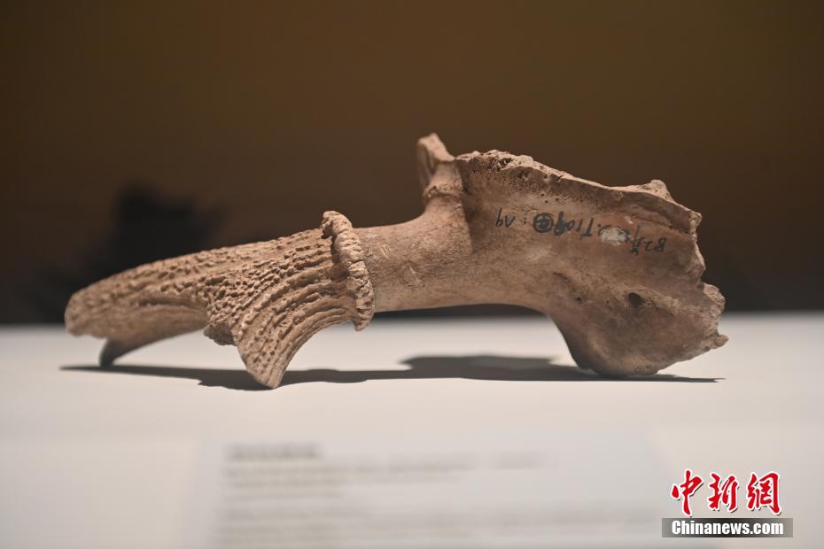 10月22日,2024青年漢學家研修計劃甘肅班團隊22個國家的青年漢學家,走進甘肅省天水市秦安縣大地灣遺址參觀并進行專題研修。大地灣遺址是新石器時代大型聚落遺址,出土了中國乃至世界上最早的彩陶文化、最早的文字符號、種植生產了中國第一批糧食品種黍、出現了最早的宮殿式建筑、發(fā)明了世界最早的水泥地面、創(chuàng)造了最早的繪畫作品——F411地畫。圖為大地灣博物館展品梅花鹿角。中新社記者 李亞龍 攝