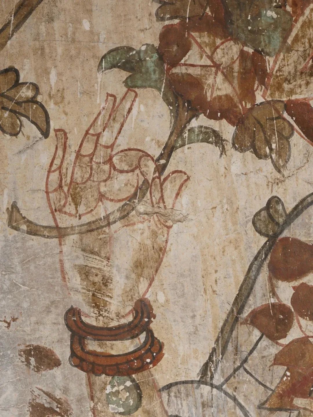 昌馬石窟第4窟洞窟形制及其殘存的塑像對于研究中國早期石窟藝術(shù)與佛教造像藝術(shù)極其重要。窟內(nèi)壁畫內(nèi)容是四壁上方畫條式旌幡,下畫供養(yǎng)菩薩,身高近2米,今殘存20身,菩薩周圍畫纏枝蓮,與第二窟基本相同??唔斍鞍氩康卣檀蟛糠置撀?,靠近中心柱正面上部右側(cè)的部位殘存龜形六瓣團(tuán)花圖案與一身飛天及菊花紋圖案。后部中心柱頂部周圍窟頂表面繪龜形六瓣團(tuán)花、連珠紋等圖案。