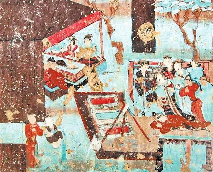 古人會在一年的歲末舉行一次集體聚會,稱作“建福”。在敦煌文獻(xiàn)《社司轉(zhuǎn)帖》中寫道:“右緣常年建福一日,人各爐餅壹雙,凈粟壹斗。幸請諸公等,帖至限今月廿二日卯時于安家酒店取齊。”意思是說,只要有可能,每年到了年末大家都要選擇一日來進(jìn)行建福。每家每戶需要按時把準(zhǔn)備建福的物資送過來。唐朝詩人李白在《客中行》一詩中寫道:“蘭陵美酒郁金香,玉碗盛來琥珀光。但使主人能醉客,不知何處是他鄉(xiāng)。”意思是說蘭陵美酒甘醇甜美,就像郁金香一樣芬芳四溢。興來盛滿玉碗,泛出琥珀光晶瑩迷人。主人端出如此好酒,定能醉倒他鄉(xiāng)之客。飲酒之后哪能分清故鄉(xiāng)與他鄉(xiāng)呢?歲暮聚飲蘊(yùn)含有辭舊迎新、攘兇納吉的美好愿望。在莫高窟第12窟壁畫中有一幅“帳篷酒肆圖”:畫面中圍坐在條形長桌兩邊正盡興暢飲的客人為七人,還有兩個熱情忙碌的服務(wù)人員。整個畫面是一幅酒酣耳熱、興致高昂的歡飲圖。更為氣勢恢宏、熱鬧非凡的是莫高窟第23窟壁畫中一幅“院落圖”:畫面中分院落之內(nèi)與院落之外兩個部分,院落之內(nèi)是世俗的世界,畫面上布局著鱗次櫛比的廳堂房屋,有人正在庖廚、有人正在對弈、有人正在暢聊、有人正在團(tuán)聚,也有人正在說教,總之表現(xiàn)的是我們?nèi)粘I畹陌賾B(tài)。院落之外是佛國世界,整體呈現(xiàn)出肅穆莊嚴(yán)之感。有趣的是在佛國與世俗世界中間,畫的是服飾艷麗,騎馬遠(yuǎn)行的人們。